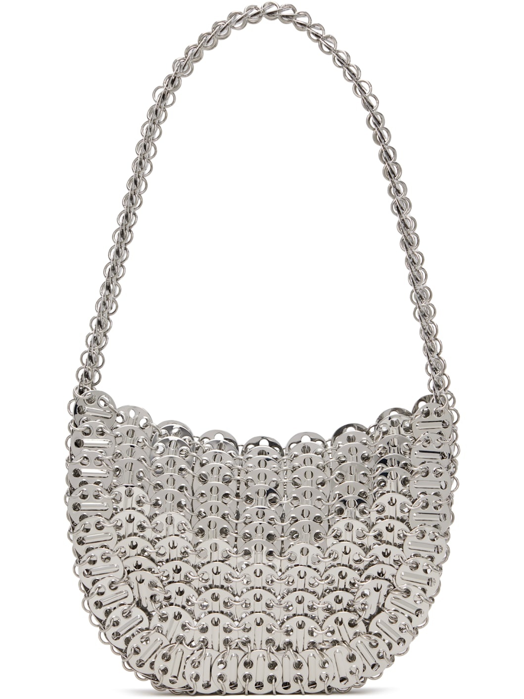 Handcrafted chain-mail-style shoulder bag in silver-tone brass. · Fixed shoulder strap · Open throat · Unlined · H5" x W7" x D1" Supplier color: Silver Brass. Made in Madagascar 252605F048002