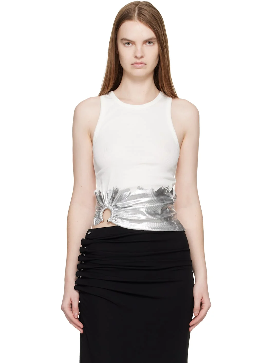 Ribbed stretch cotton jersey tank top. · Scoop neck · Covered hardware and gathering at front hem · Bonded foil at hem Supplier color: White/Silver 97% cotton, 3% elastane. Made in Portugal 261605F111000