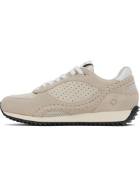 Low-top paneled suede and mesh sneakers in beige. · Perforations and buffed leather trim throughout · Lace-up closure · Logo flag at padded tongue · Padded collar · Graphic applique at sides · Blanket stitching at sides and heel · OrthoLite® Lazy-Hybrid™ padded footbed · Mesh lining · Treaded rubber sole Supplier color: Pearl grey Upper: leather, textile. Sole: rubber. Made in Viet Nam 251055F128000