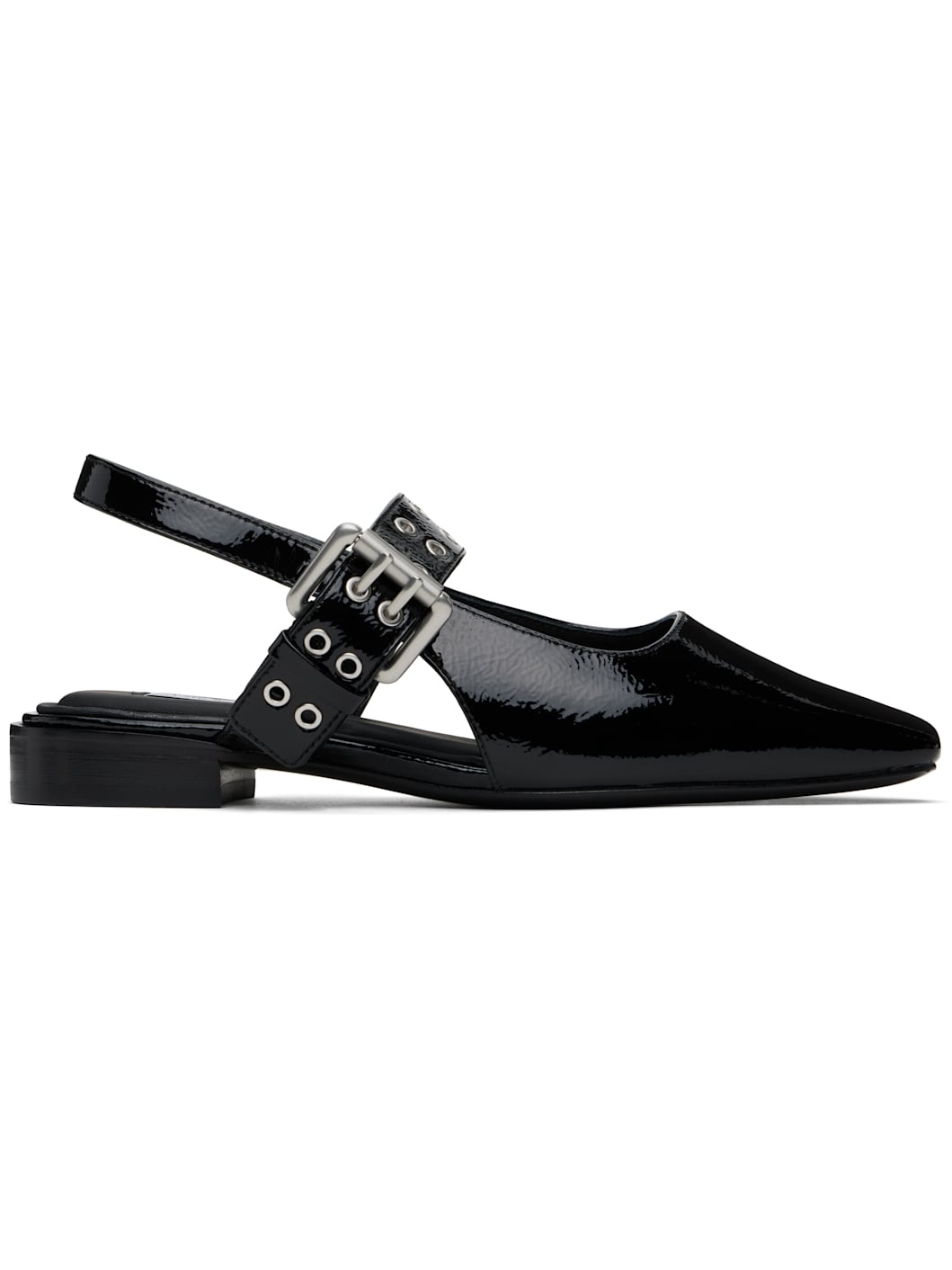 Grained patent leather ballerina flats in black. · Pointed square toe · Pin-buckle strap at vamp · Partially elasticized slingback strap · Leather lining · Block heel with rubber injection · Leather sole · Logo-engraved silver-tone hardware Supplier color: Black Upper: leather. Sole: leather, rubber. Made in Viet Nam 251055F118007