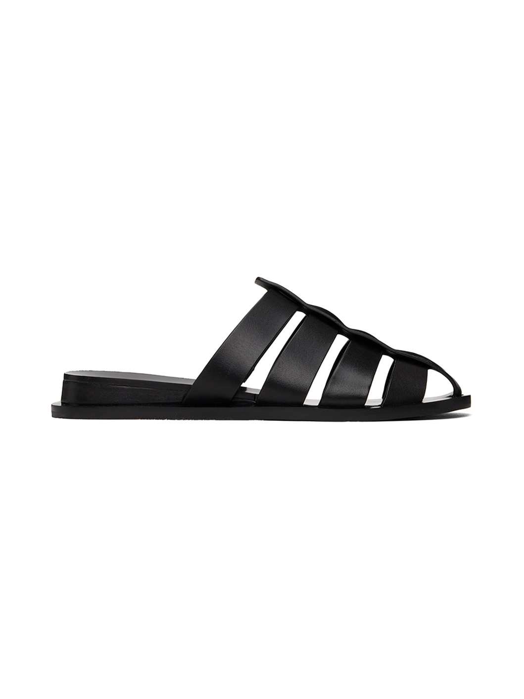 Buffed leather slip-on sandals in black. · Logo embossed at molded footbed · Covered wedge heel · Rubber sole · Heel: H1" Supplier color: Black Upper: leather. Sole: rubber. Made in Viet Nam 242055F124005