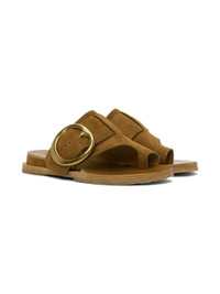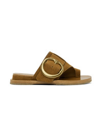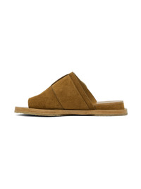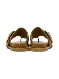Suede slip-on sandals in tan. · Toe strap at open round toe · Pin-buckle strap and at vamp · Logo embossed at buffed leather footbed · Stacked leather midsole · Rubber outsole Supplier color: Tobacco Upper: leather. Sole: leather, rubber. Made in Viet Nam 231055F124006