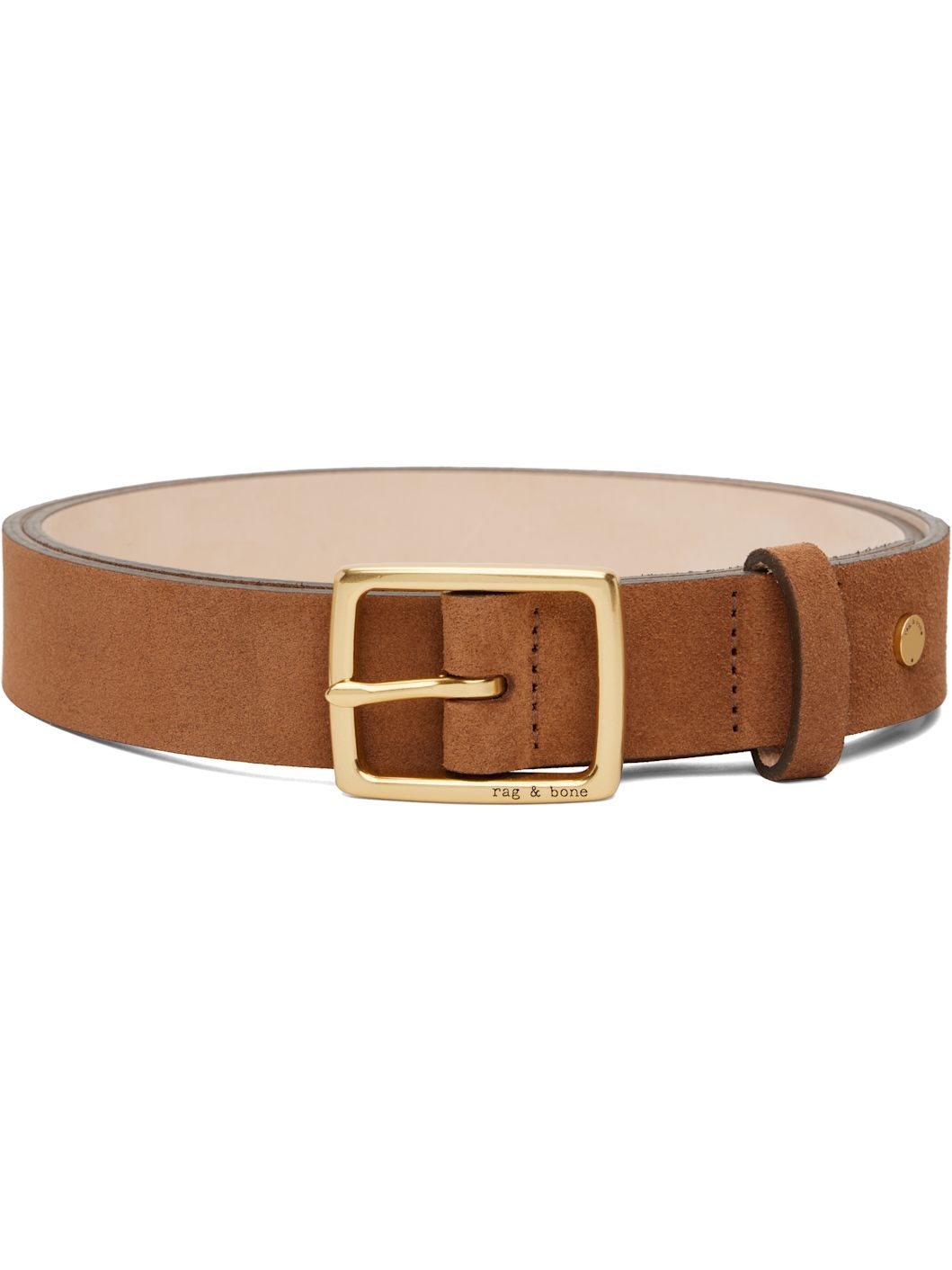Suede belt in tan. · Rivet and keeper loop at length · Pin-buckle fastening · Logo-engraved gold-tone hardware · W1.25" Supplier color: Pecan suede Leather. Made in United Kingdom 252055F001012