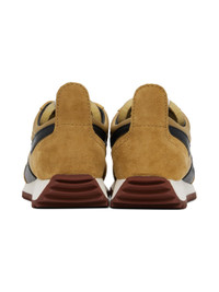 Low-top paneled recycled polyester taffeta and calfskin suede sneakers in tan. · Lace-up closure · Logo patch and raw edge at tongue · Padded tongue and collar · Pull-tab at heel collar · Grained calfskin graphic applique at sides · Grained calfskin and faille lining · Molded EVA footbed · EVA foam rubber midsole · Treaded rubber outsole Supplier color: Mustard Upper: textile, calfskin. Sole: rubber. Made in Viet Nam 242055F128007