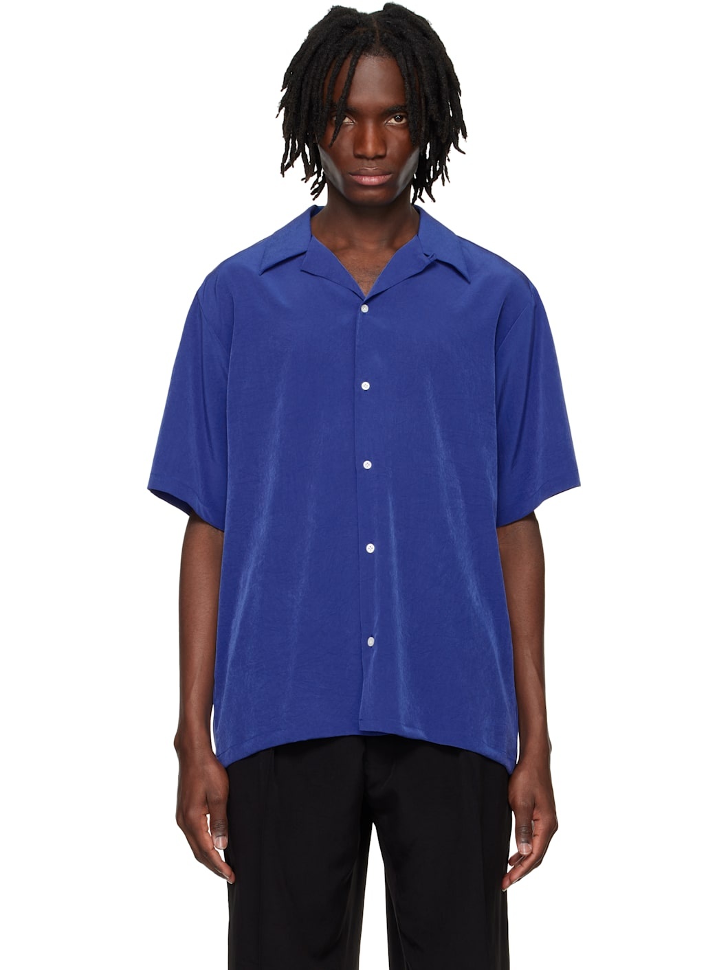 Lightweight triacetate-blend crepe satin shirt. · Open spread collar · Button closure · Twin pleats at back yoke Supplier color: Blue 57% triacetate, 43% polyester. Made in Japan 251599M192001