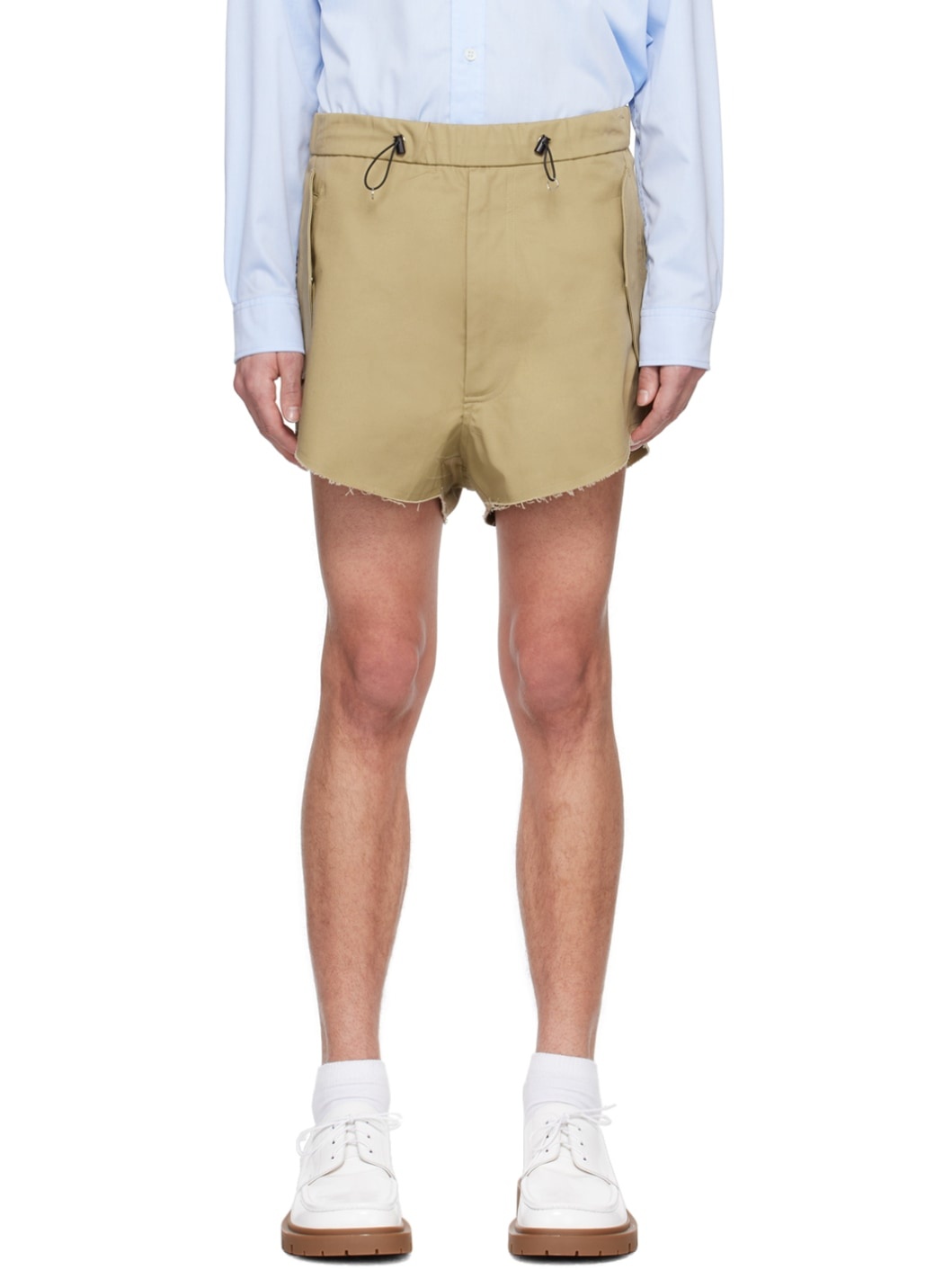 Cotton canvas shorts. · Bungee-style drawstring at elasticized waistband · Two-pocket styling · Raw edges at curved cuffs · Zip closure at back Supplier color: Beige 100% cotton. Made in Poland 241172M193000