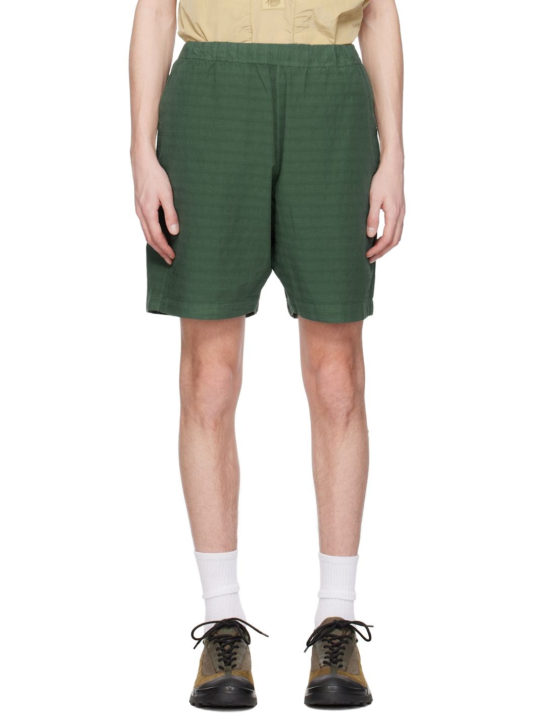 Plain-woven cotton- and silk-blend shorts. Stripes throughout. · Elasticized waistband · Three-pocket styling · Logo patch at back pocket Supplier color: Kombu green 88% cotton, 12% silk. Made in Italy 251504M193001
