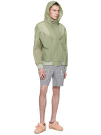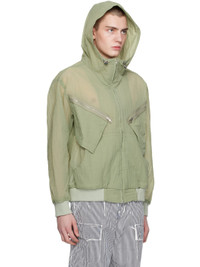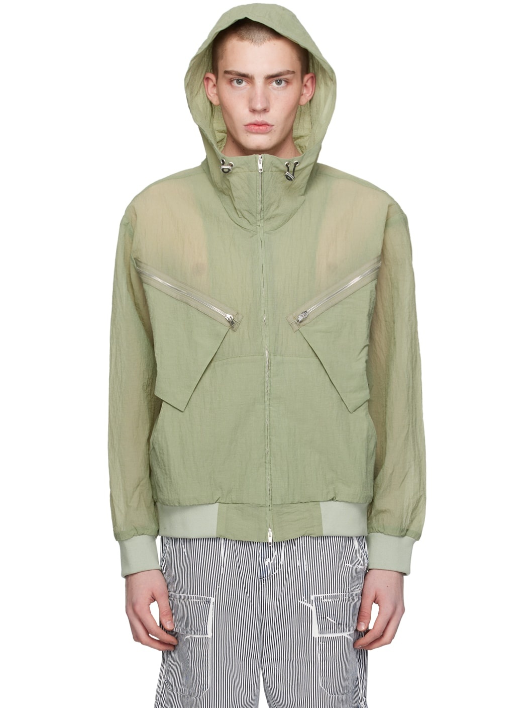 Semi-sheer crinkled nylon ripstop jacket. Subtle fading throughout. · Bungee-style drawstring at hood · Two-way zip closure · Zip and patch pockets · Rib knit hem and cuffs · Dropped shoulders Supplier color: Dark olive Body: 100% polyamide. Trim: 90% polyester, 5% elastane, 5% polyamide. Made in Italy 241504M180004