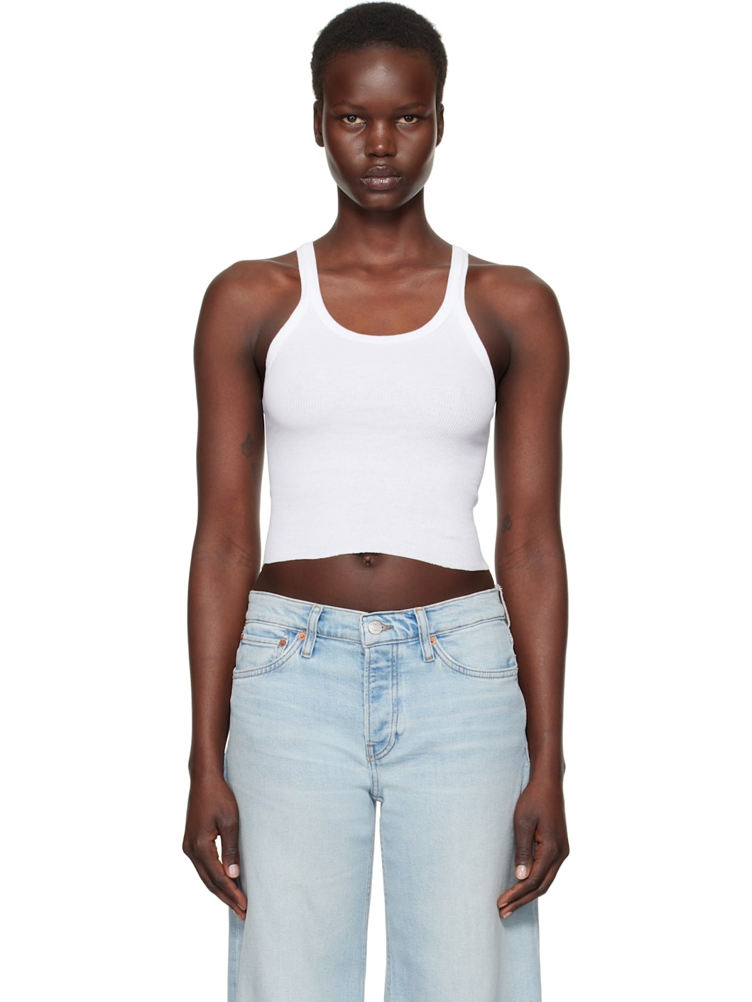 Cotton ribbed jersey tank top. · Scoop neck · Raw edge at cropped hem Part of the Re/Done x Hanes collaboration. Supplier color: Optic white 100% cotton. Made in United States 251800F111004