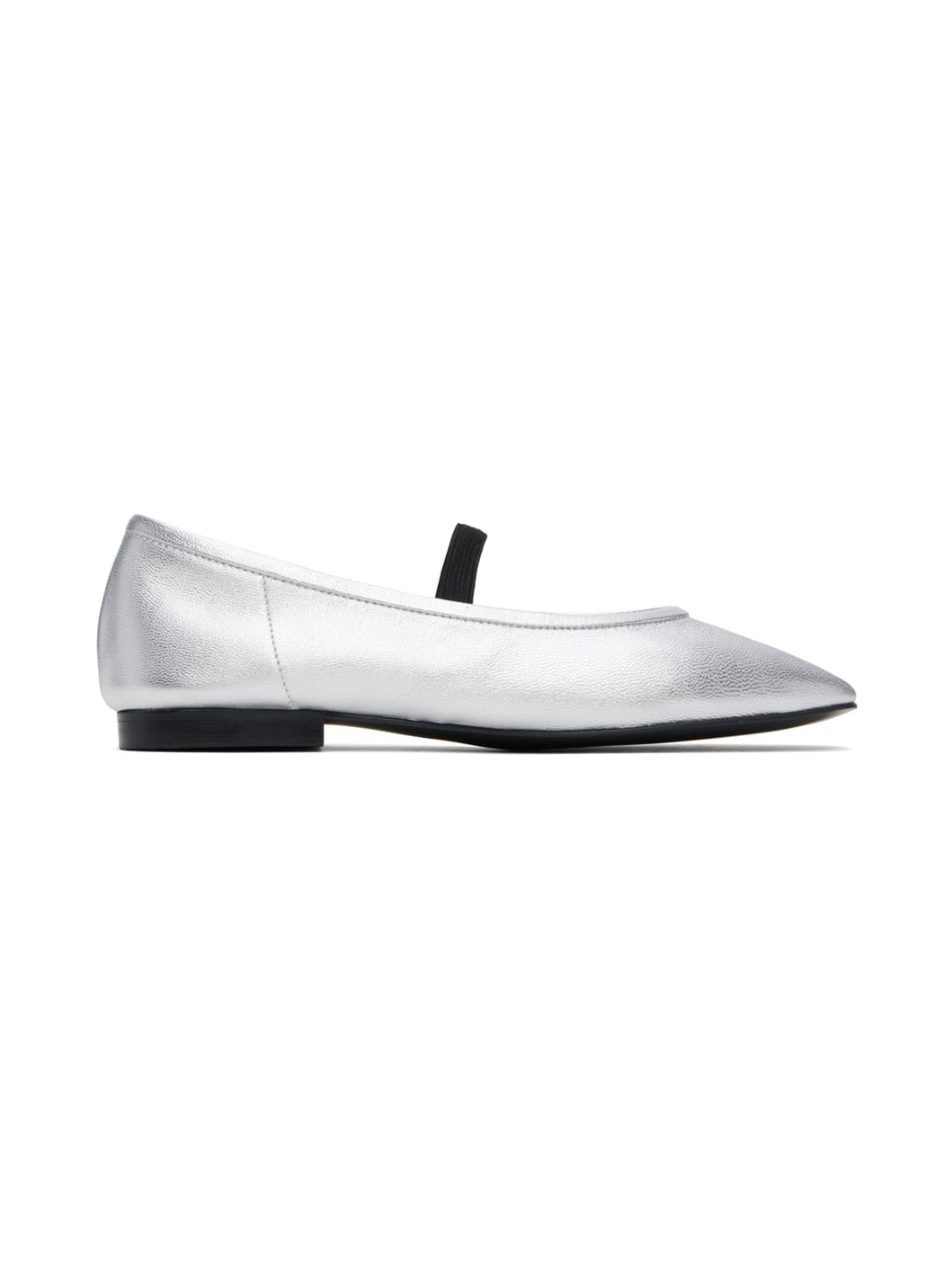 Grained leather ballerina flats in metallic silver tone. · Square toe · Elasticized strap at vamp · Logo hardware at outer side · Logo printed at padded footbed · Lambskin suede lining · Smooth rubber sole Supplier color: Silver Upper: leather. Sole: rubber. Made in South Korea 241775F118001