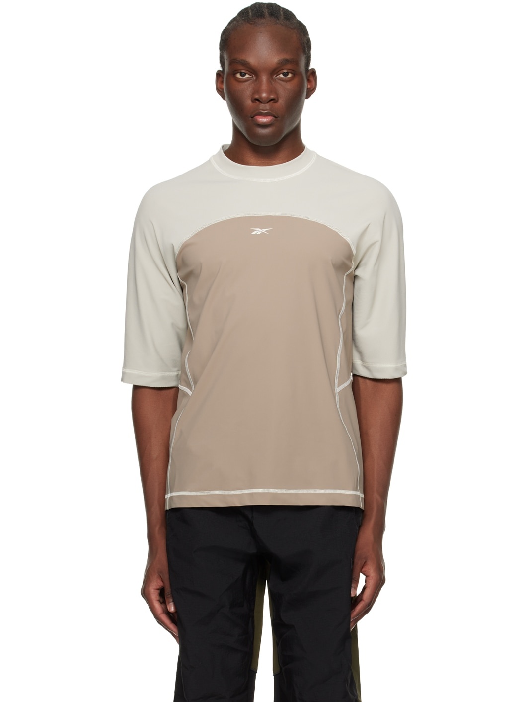 Stretch nylon jersey and ribbed jersey T-shirt. · Paneled construction · Crewneck · Logo printed at front and back · Yoke sleeves · Contrast overlock stitching in off-white Supplier color: Tan 85% polyamide, 15% elastane. Made in Romania 241749M213006