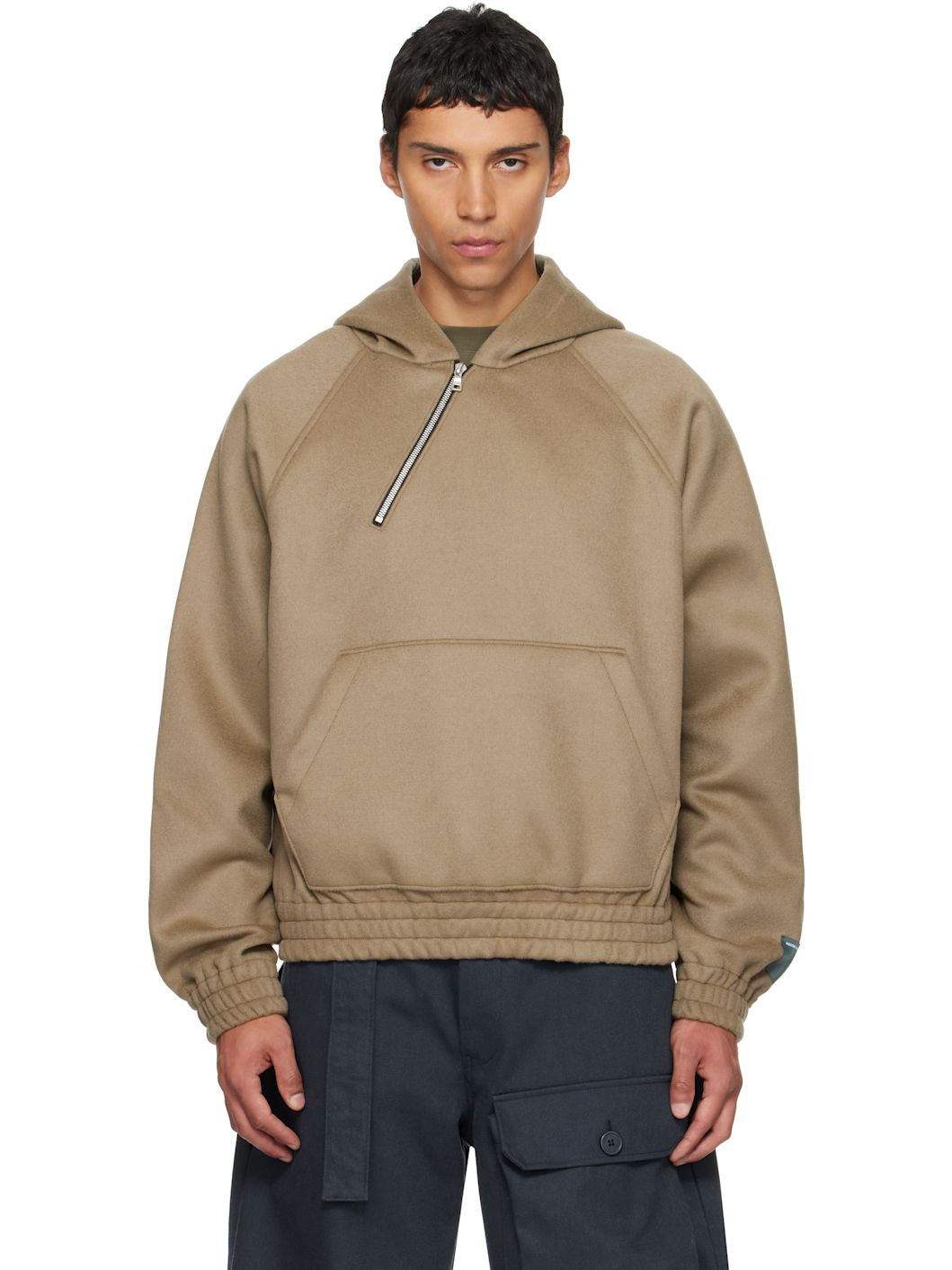 Merino wool melton hoodie. · Heavyweight · Offset half-zip closure · Kangaroo pocket · Elasticized hem and cuffs · Raglan sleeves · Logo patch at cuff Supplier color: Warm grey Body: 100% wool. Trim: 100% rayon. Made in United States 252115M202000