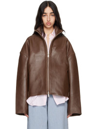 LWG-certified buffed lambskin jacket. Raw edges throughout. · Stand collar · Two-way zip closure · Seam pockets · Dropped shoulders · Fully lined Supplier color: Root beer Body: 100% lambskin. Lining 1: 100% polyester. Lining 2: 59% viscose, 41% polyester. Made in India 251985F057001