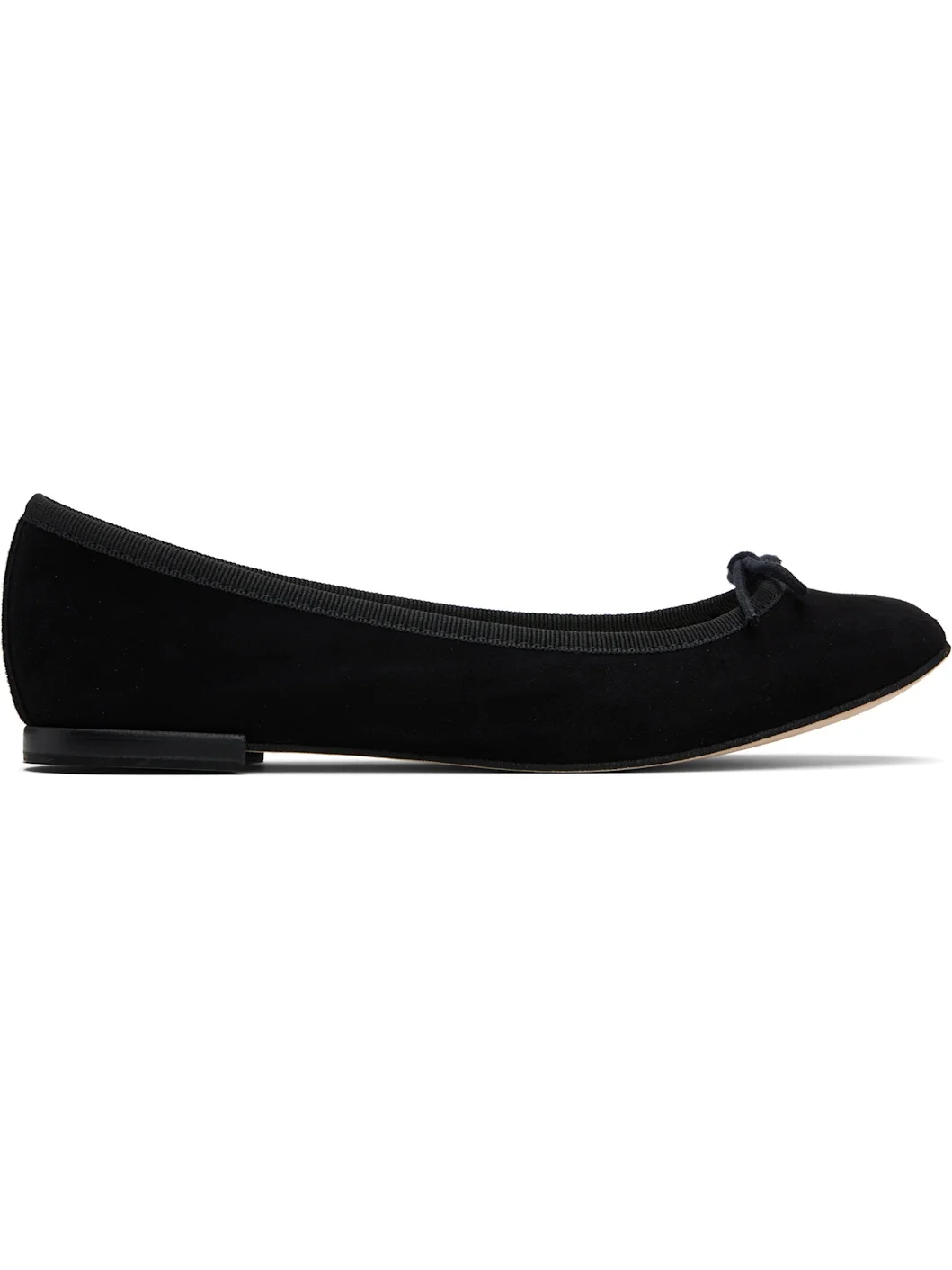 Goatskin suede ballerina flats. · Bow accent at vamp · Grosgrain trim at collar · Twill lining · Stacked leather heel with rubber injection · Leather sole Supplier color: Black Upper: goatskin. Sole: leather, rubber. Made in France 252296F118043