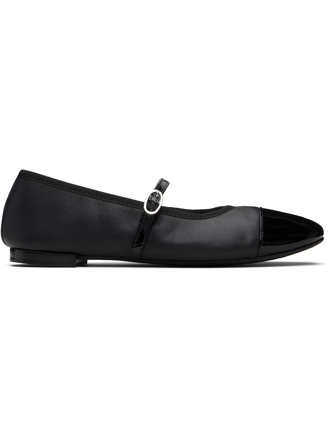 Grained and patent leather Mary Jane-style ballerina flats. · Square cap toe · Pin-buckle strap at vamp · Grosgrain trim at collar · Cotton twill lining · Stacked leather heel with rubber injection · Treaded rubber sole Supplier color: Black Upper: leather. Sole: rubber. Made in France 252296F118017