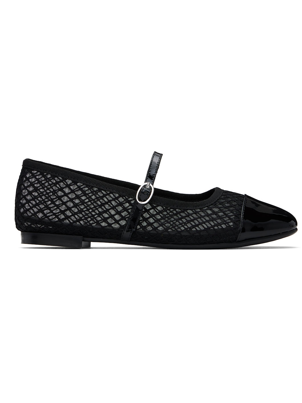 Sheer mesh and patent leather Mary Jane-style ballerina flats in black. · Square cap toe · Pin-buckle strap at vamp · Grosgrain trim at collar · Cotton twill lining · Stacked leather heel with rubber injection · Treaded rubber sole Supplier color: Black Upper: textile, leather. Sole: rubber. Made in France 251296F118086