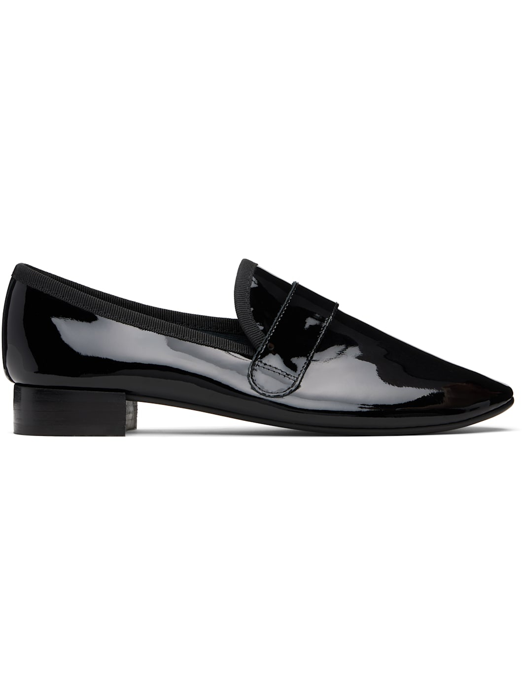 Patent leather loafers. · Strap at vamp · Grosgrain trim at tongue and collar · Knit lining · Stacked leather heel with rubber injection · Treaded rubber sole · Heel: H1" Supplier color: Black Upper: leather. Sole: rubber. Made in France 252296F121002