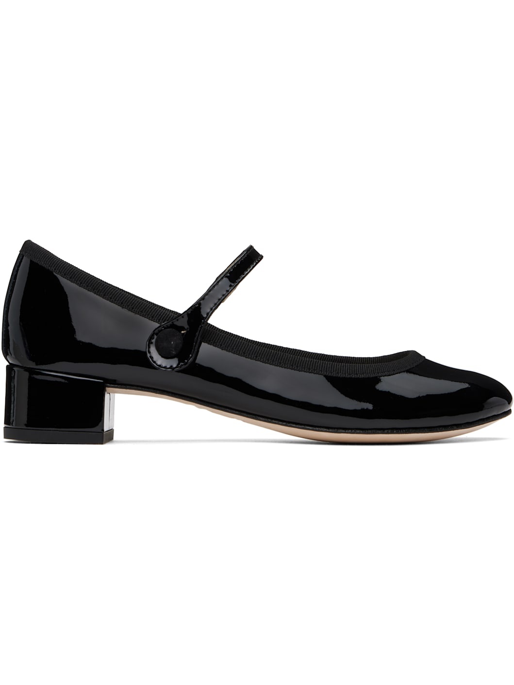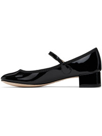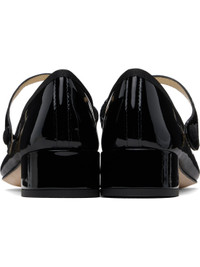 Patent leather Mary Jane-style heels in black. · Strap at vamp · Grosgrain trim at collar · Jersey lining · Covered block heel with rubber injection · Nubuck sole · Heel: H1.5" Supplier color: Black Upper: leather. Sole: leather, rubber. Made in France 251296F122028