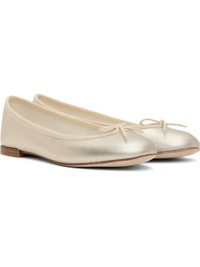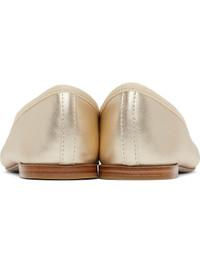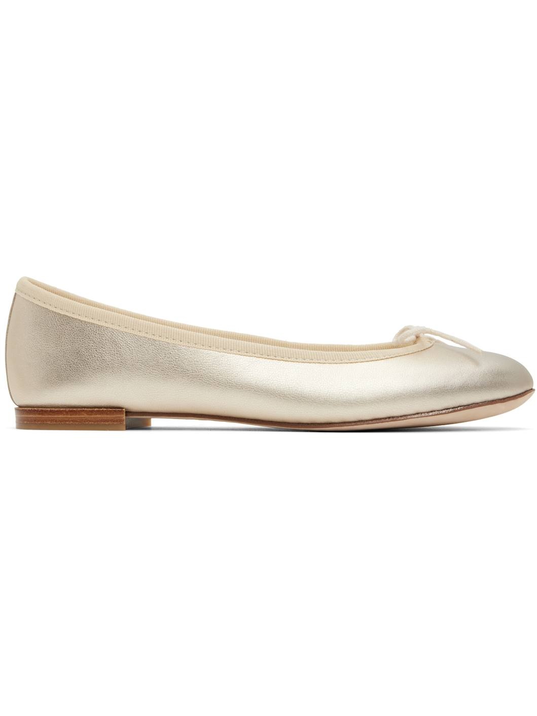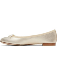 Nappa calfskin ballerina flats in metallic gold tone. · Bow accent at vamp · Grosgrain trim at collar · Cotton twill lining · Stacked leather heel with rubber injection · Suede sole Supplier color: Light gold Upper: calfskin. Sole: leather, rubber. Made in France 251296F118080