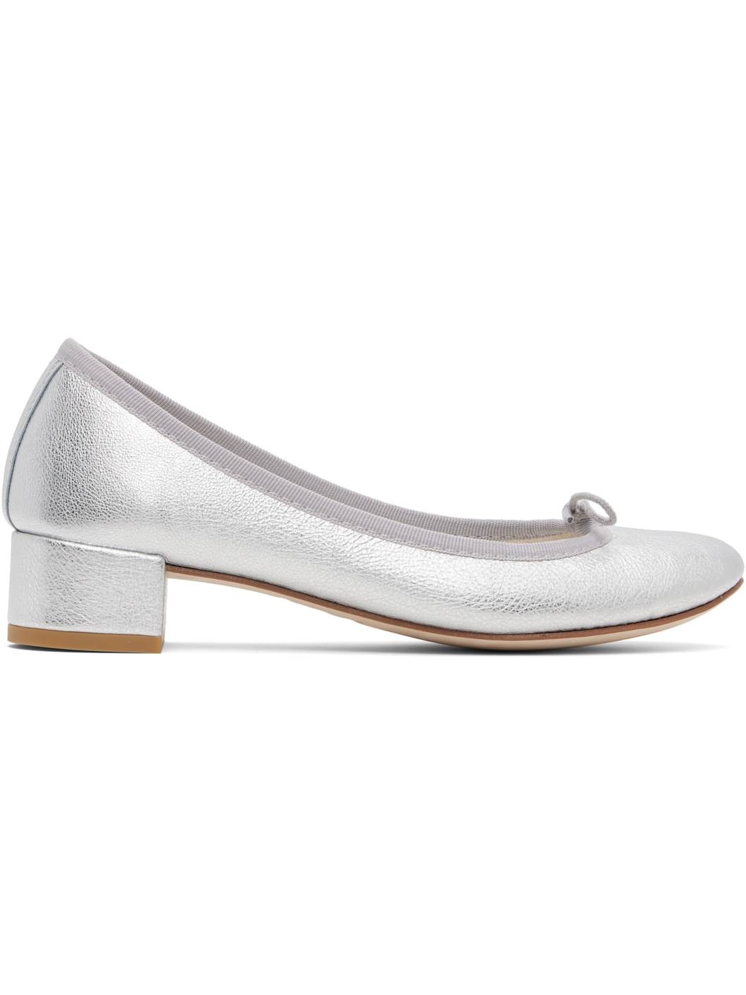 Grained lambskin heels. · Bow accent at vamp · Grosgrain trim at collar · Twill lining · Covered heel with rubber injection · Leather sole · Heel: H1.5" Supplier color: Silver Upper: lambskin. Sole: leather, rubber. Made in France 252296F122003