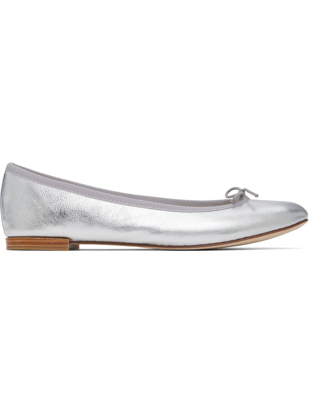 Nappa calfskin ballerina flats in silver tone. · Bow accent at vamp · Grosgrain trim at collar · Cotton twill lining · Stacked leather heel with rubber injection · Nubuck sole Supplier color: Silver Upper: calfskin. Sole: leather, rubber. Made in France 251296F118082