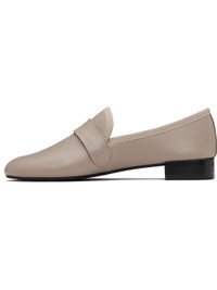 Grained calfskin loafers. · Strap at vamp · Grosgrain trim at tongue and collar · Plain-woven cotton lining · Stacked leather heel with rubber injection · Treaded rubber sole · Heel: H1" Supplier color: Beige taupe Upper: calfskin. Sole: leather, rubber. Made in France 252296F121000