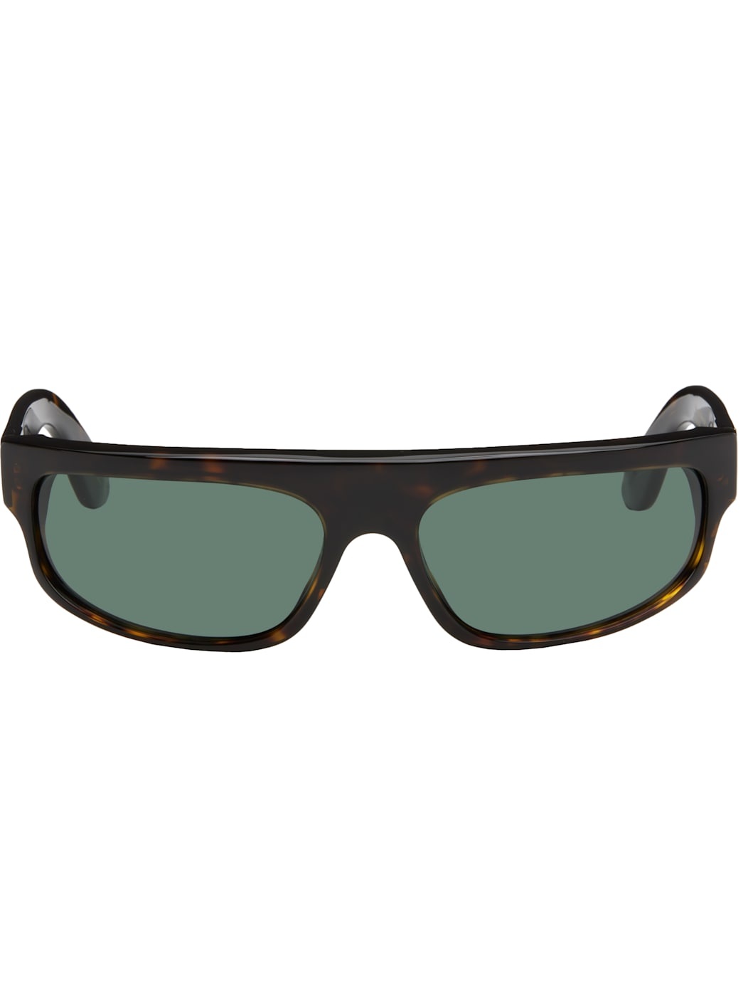 Wraparound rectangular tortoiseshell acetate-frame sunglasses in tones of brown. · Handcrafted · Green Carl Zeiss lenses · Integrated nose pads · Inset logo hardware at temples · Exposed core wires · Gold-tone hardware · Includes pouch · Size: 63.17 130 Supplier color: Havana Acetate. Made in Italy 252191M134026