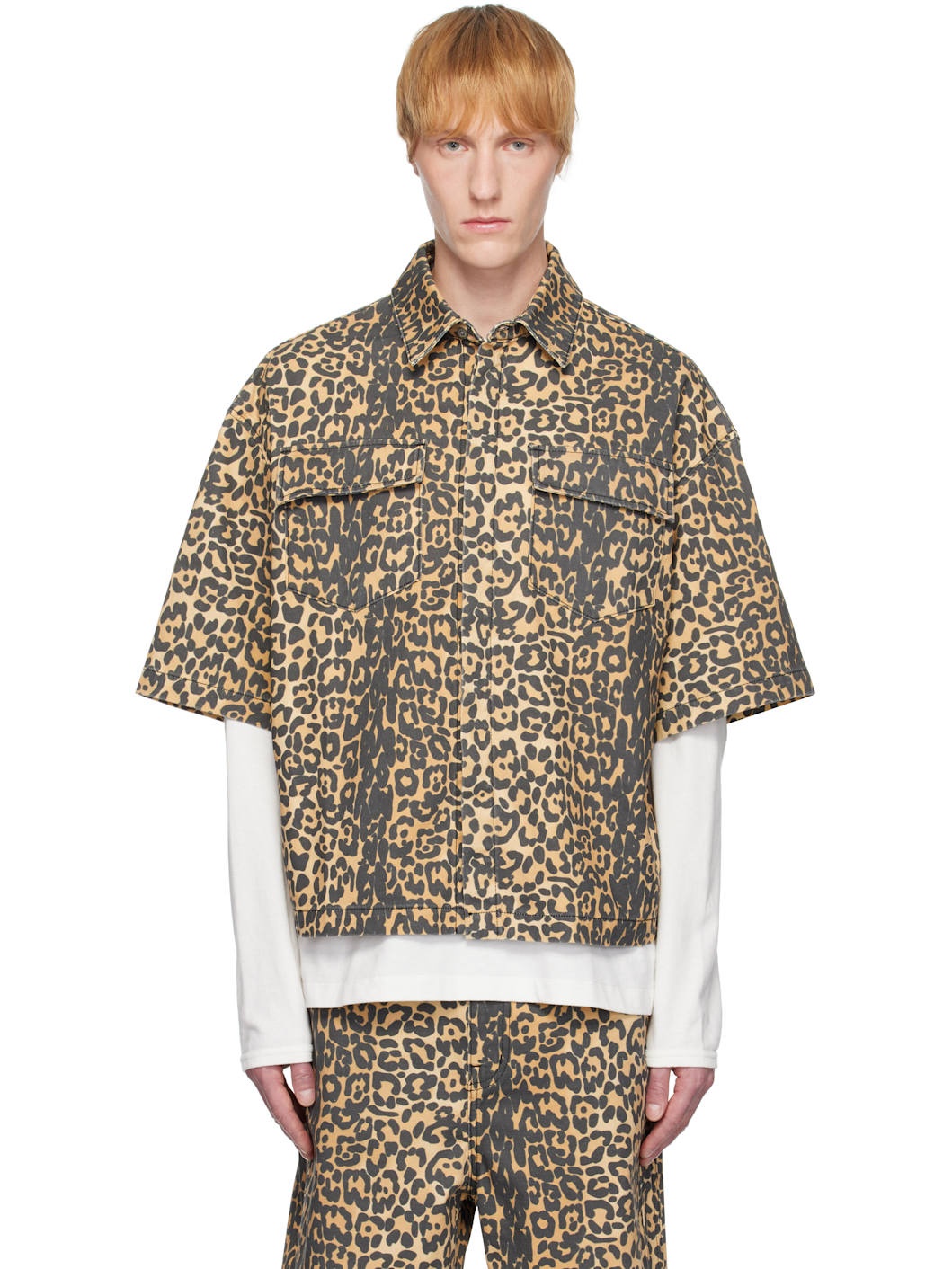 Boxy-fit non-stretch denim shirt. Leopard patten printed throughout. · Spread collar · Concealed button closure · Flap pockets · Dropped shoulders Supplier color: Black/Tan 100% cotton. Made in United States 252923M192000