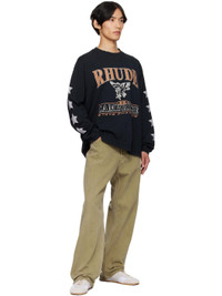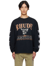 Cotton jersey T-shirt. · Rib-knit crewneck and cuffs · Logo, graphic, and text printed at front · Graphics printed at sleeves · Dropped shoulders Supplier color: Vintage black 100% cotton. Made in United States 252923M213026