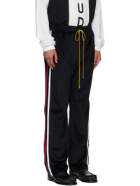 Velour track pants. · Drawstring at elasticized waistband · Four-pocket styling · Logo embroidered at front · Stripes at outseams Supplier color: Black/Red/White Body: 100% polyester. Trim: 85% polyester, 15% spandex. Pocket lining: 100% lyocell. Made in United States 252923M190009