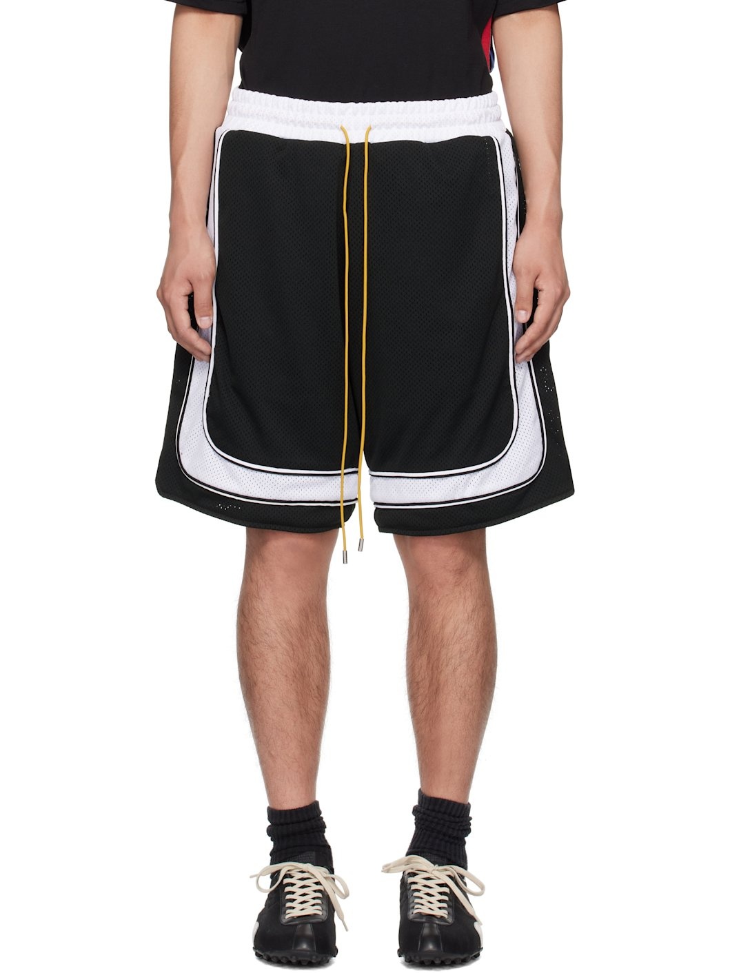 Double-faced polyester mesh shorts. · Drawstring at elasticized waistband · Four-pocket styling · Piping and vent at outseams Supplier color: Black/White 100% polyester. Made in United States 252923M193006