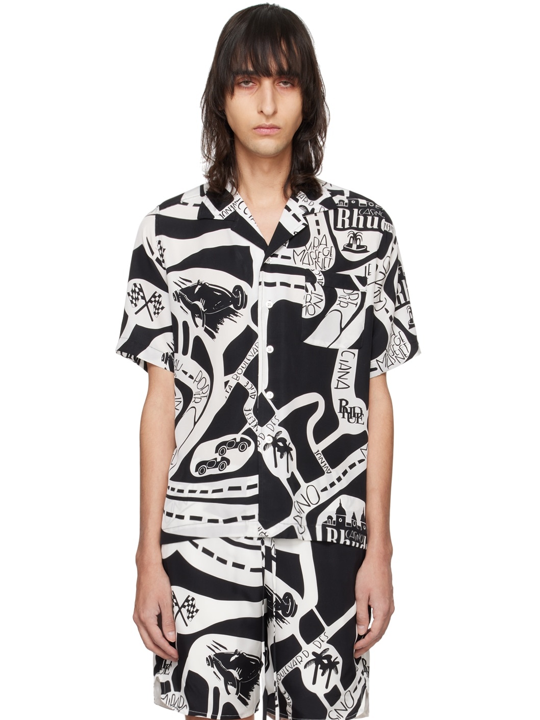 Hand-treated silk twill shirt. Logo graphic pattern printed throughout. · Open spread collar · Button closure · Patch pocket Supplier color: Black/White 100% silk. Made in United States 241923M192016