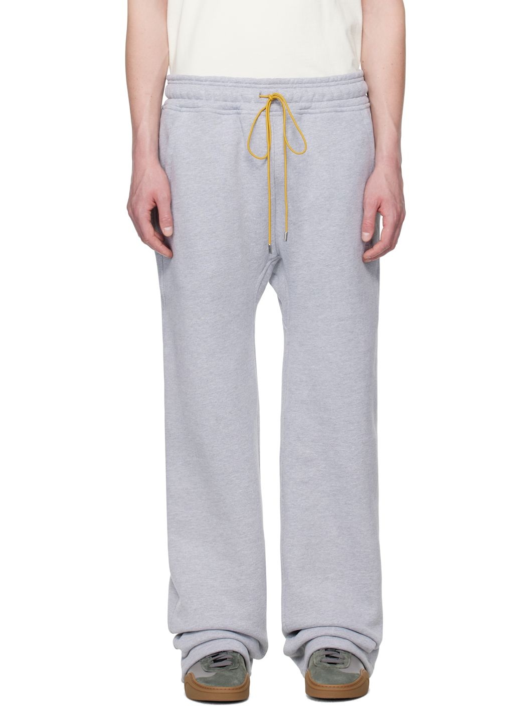Heavyweight cotton-blend fleece sweatpants. · Drawstring at elasticized waistband · Three-pocket styling · Logo embroidered at front · Gusset at inseam Supplier color: Heather gray 98% cotton, 2% polyester. Made in United States 251923M190008