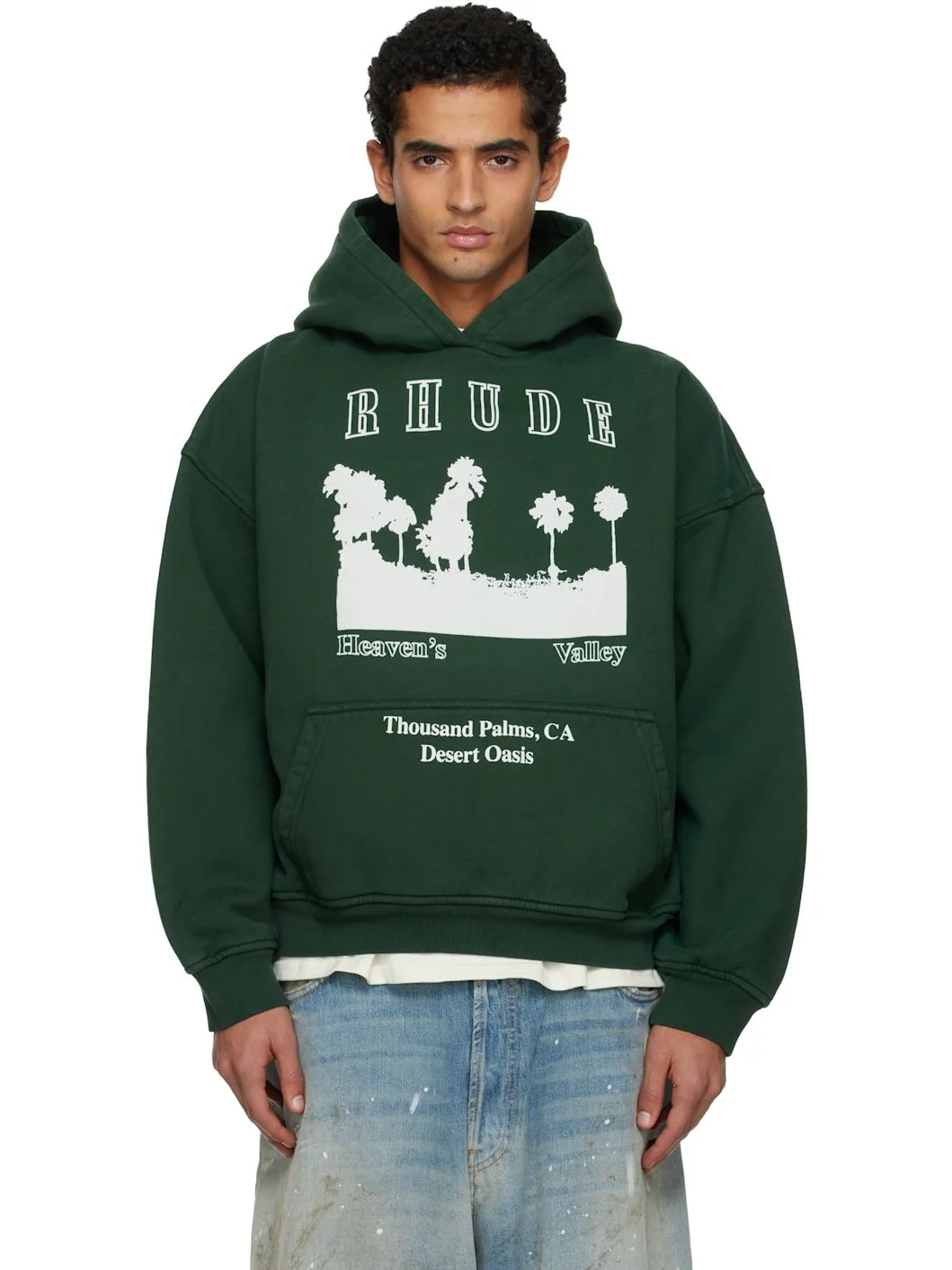 Cotton fleece hoodie. · Logo, graphic, and text printed at front · Kangaroo pocket · Rib-knit hem and cuffs · Dropped shoulders Supplier color: Vintage forest green 100% cotton. Made in United States 252923M202025