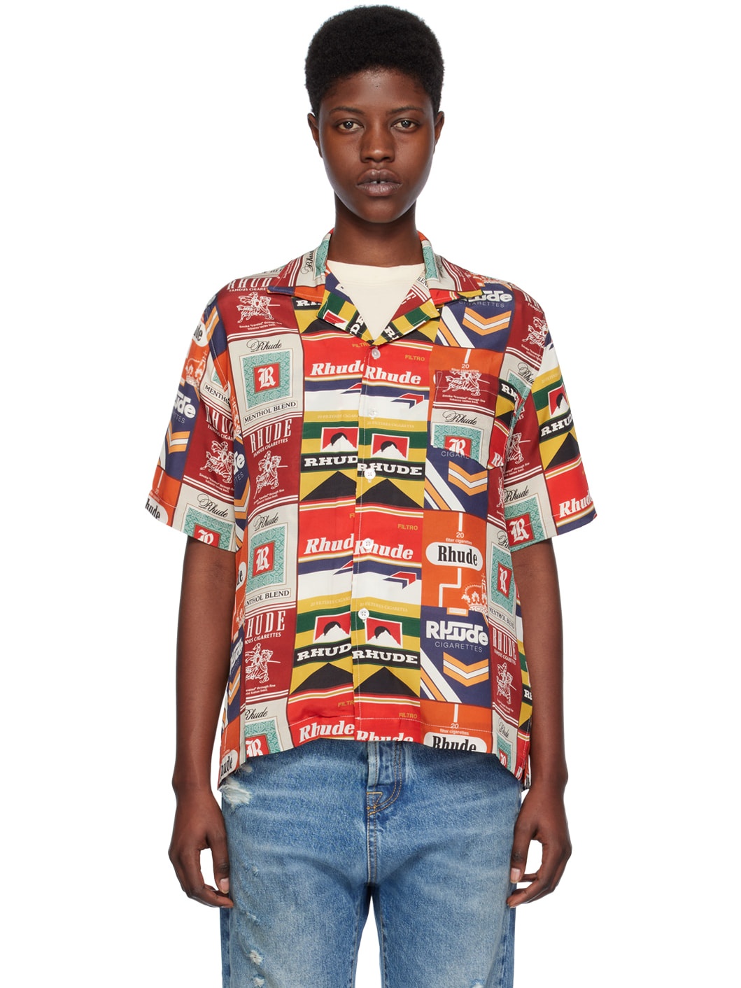 Silk satin shirt. Logo graphic printed throughout. · Open spread collar · Button closure · Patch pocket · Tennis-tail hem Supplier color: Red multi 100% silk. Made in United States 241923F109002