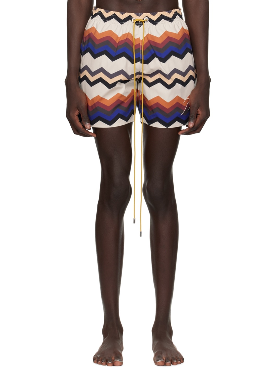 Polyester taffeta swim shorts. Graphic printed throughout. · Drawstring at elasticized waistband · Three-pocket styling · Logo embroidered at front · Vented cuffs · Partial stretch nylon mesh lining · Logo-engraved silver-tone hardware Supplier color: Multi Body: 100% polyester. Lining: 85% nylon, 15% spandex. Made in United States 241923M193012