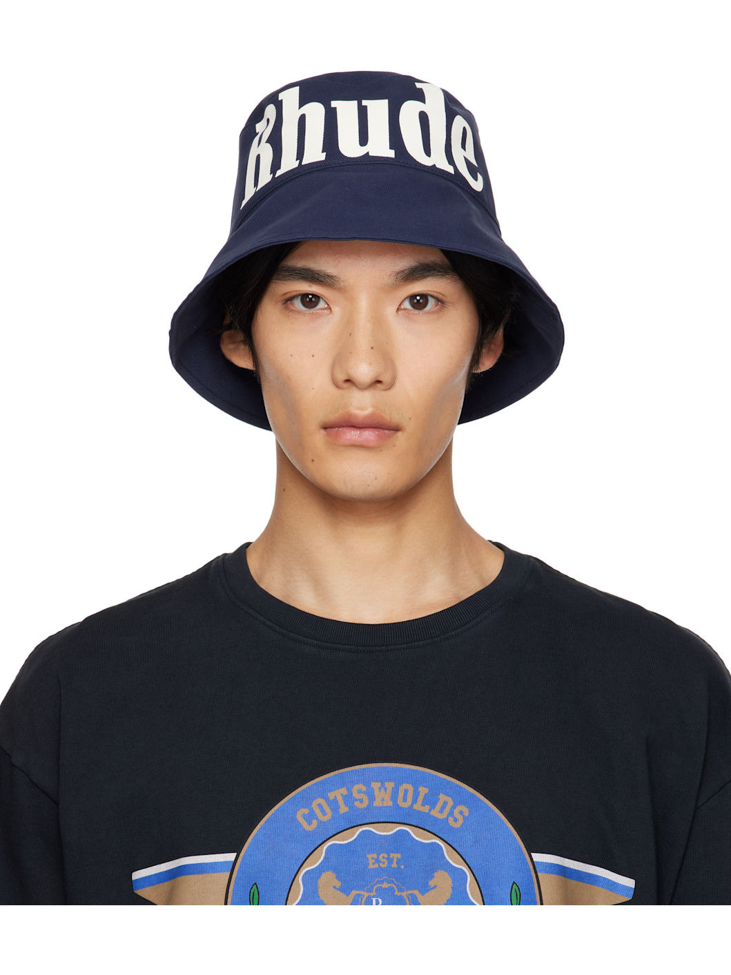Cotton twill bucket hat. · Logo printed at face · Twill lining Supplier color: Navy/Off-white 100% cotton. Made in United States 252923M140001