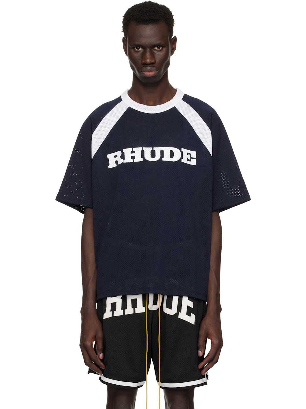 Lightweight polyester mesh T-shirt. · Relaxed-fit · Paneled construction · Crewneck · Logo printed at chest · Raglan sleeves Supplier color: Navy/Stark white 100% polyester. Made in United States 251923M213019