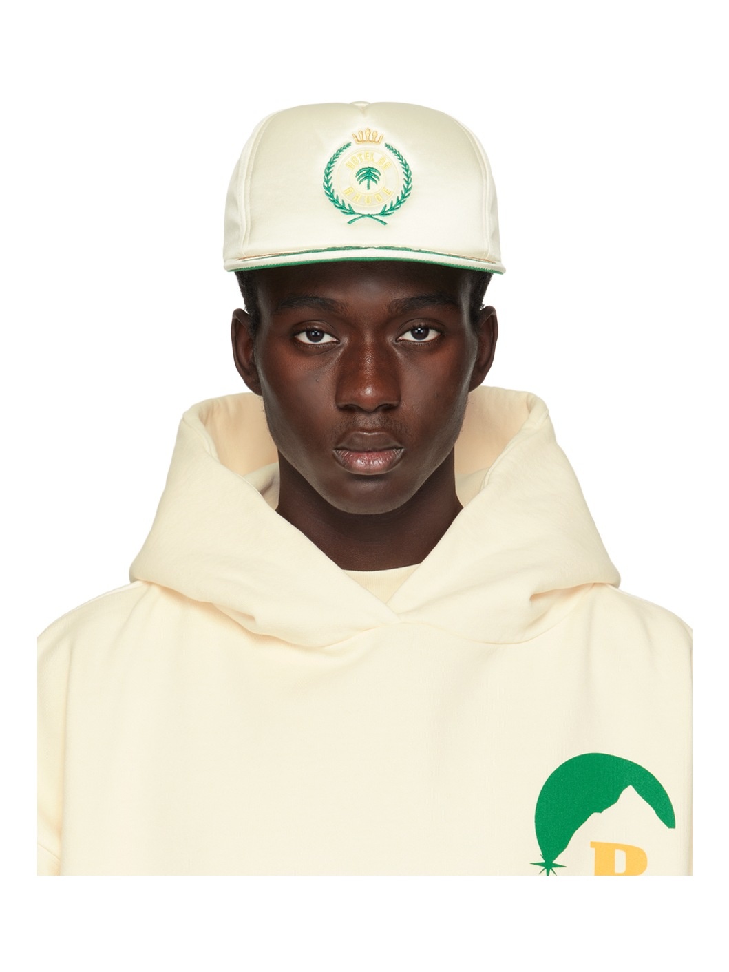Polyester satin cap in off-white. · Embroidered eyelets at crown · Logo graphic embroidered at face · Graphics embroidered at flat brim · Snapback fastening · Partial twill lining Supplier color: Off white Body: 100% polyester. Trim: 65% polyester, 35% cotton. Lining: 100% lyocell. Made in United States 241923M139013