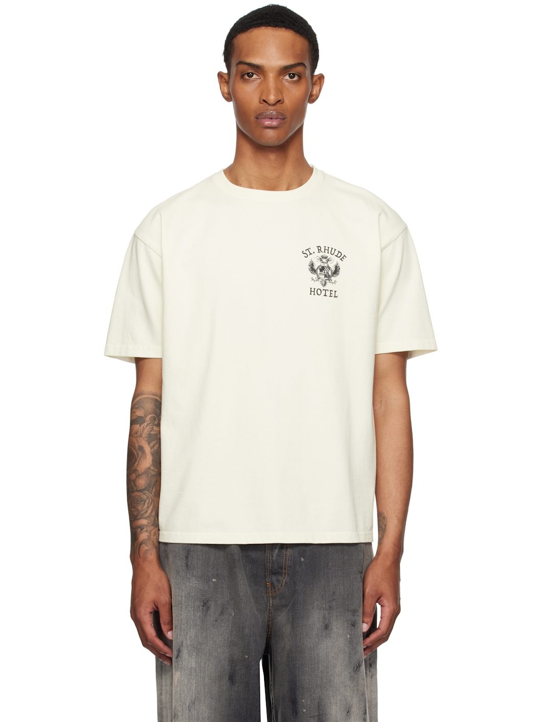 Cotton jersey T-shirt. · Rib-knit crewneck · Graphic, logo, and text printed at chest and back · Dropped shoulders Supplier color: Vintage white 100% cotton. Made in United States 252923M213006