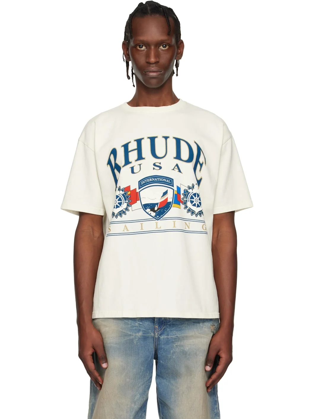 Cotton jersey T-shirt. · Rib-knit crewneck · Logo graphic printed at front · Dropped shoulders Supplier color: Vintage white/Black 100% cotton. Made in United States 261923M213014