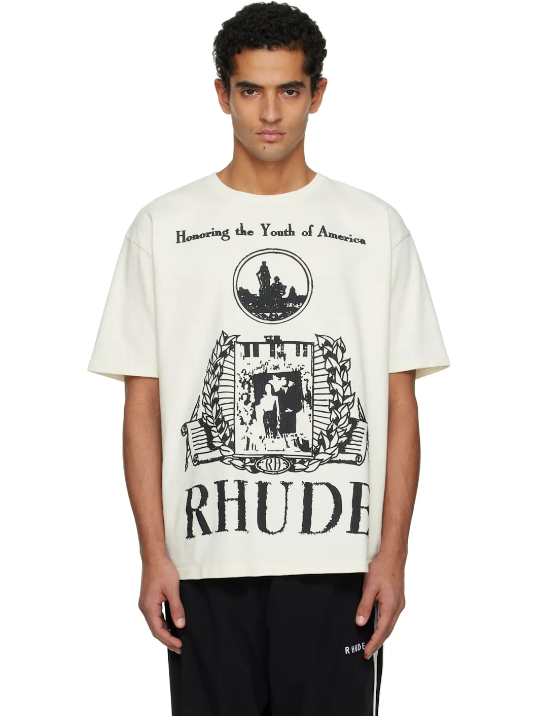 Cotton jersey T-shirt. · Rib-knit crewneck · Text, graphic, and logo printed at front · Dropped shoulders Supplier color: Vintage white/Black 100% cotton. Made in United States 252923M213051