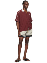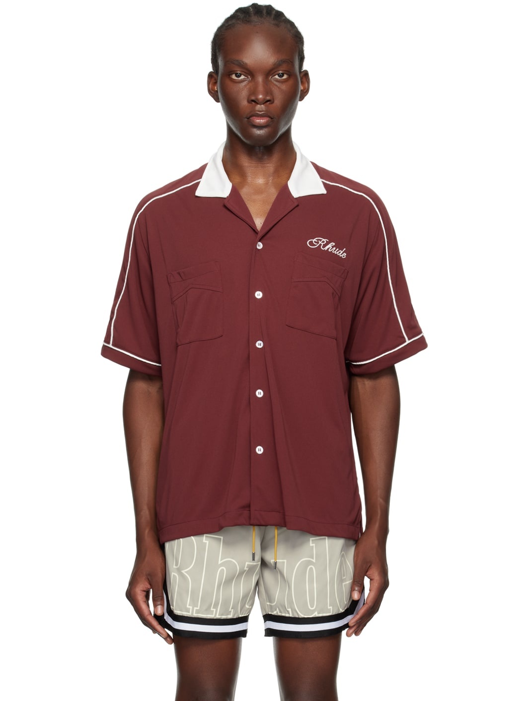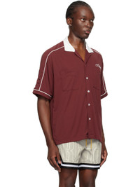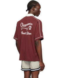 Lightweight polyester jersey shirt. Piping in off-white throughout. · Open spread collar · Button closure · Logo embroidered at chest · Patch pockets · Tennis-tail hem · Dropped shoulders · Text embroidered at back Supplier color: Maroon/White 100% polyester. Made in United States 242923M192007
