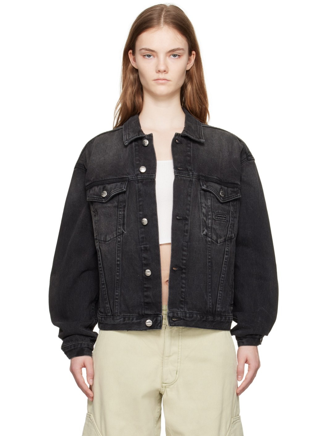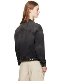 Non-stretch denim jacket. Fading throughout. · Paneled construction · Spread collar · Button closure · Flap pockets and welt pockets · Cinch tabs and leather logo patch at back hem · Logo-engraved silver-tone hardware Available exclusively at SSENSE. Supplier color: Black Body: 100% cotton. Lining: 65% polyester, 35% cotton. Made in United States 241923F060001