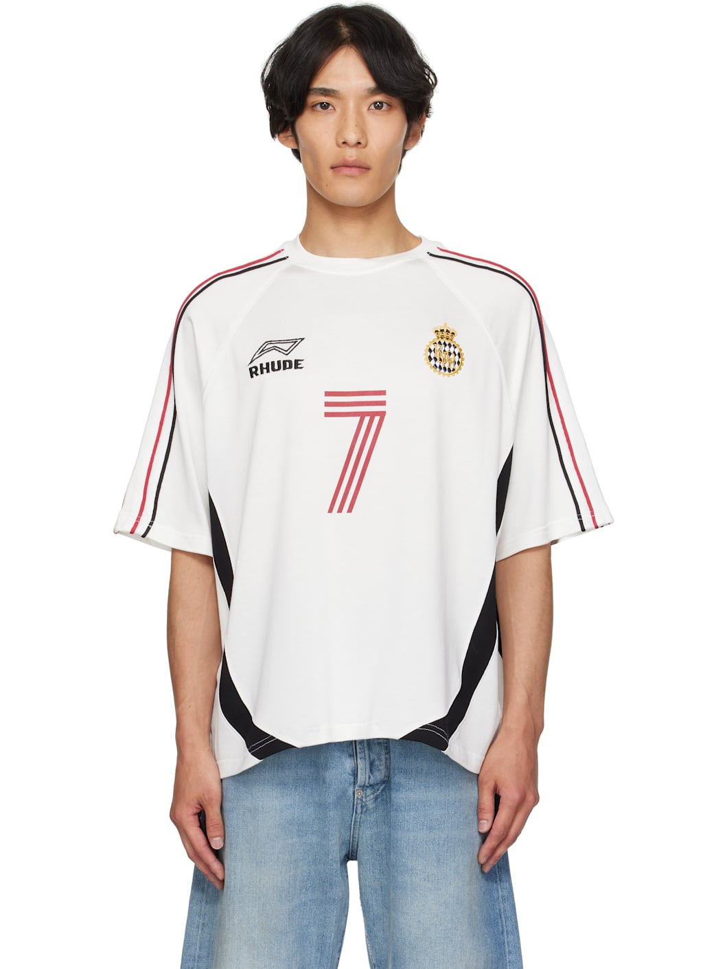 Cotton-blend jersey T-shirt. · Rib-knit crewneck · Logos embroidered at chest · Text printed at front and back · Striped trim at raglan sleeves · Logo printed at back Supplier color: White/Black/Red 63% cotton, 37% rayon. Made in United States 252923M213011