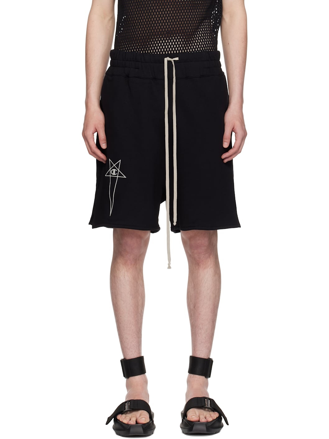 GOTS-certified organic cotton French terry shorts. · Drawstring at elasticized waistband · Two-pocket styling · Logo embroidered at front · Dropped inseam · Vented outseams · Embroidered logo patch at back Part of the Rick Owens x Champion collaboration. Supplier color: Black 100% organic cotton. Made in Italy 252232M193004