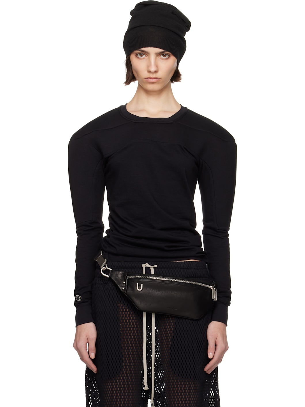 GOTS-certified organic cotton jersey sweatshirt. · Rib-knit crewneck and cuffs · Padded yoke and shoulders · Embroidered logo patch at cuff · Central seam at back Part of the Rick Owens x Champion collaboration. Supplier color: Black Body: 100% organic cotton. Trim: 96% cotton, 4% elastane. Made in Italy 252232F098007