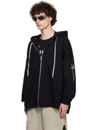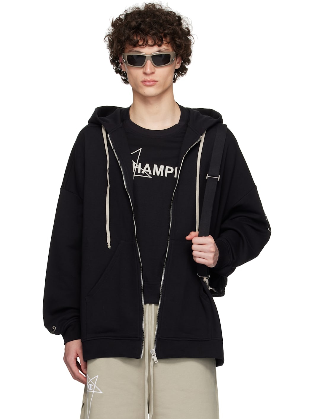 GOTS-certified organic cotton French terry hoodie. · Drawstring at hood · Zip closure · Patch pockets · Rib-knit hem and cuffs · Offset shoulder seams · Dropped shoulders · Logo embroidered at sleeve · Embroidered logo patch at cuff · Central seam at back Part of the Rick Owens x Champion collaboration. Supplier color: Black Body: 100% organic cotton. Trim: 96% cotton, 4% elastane. Made in Italy 252232M202002