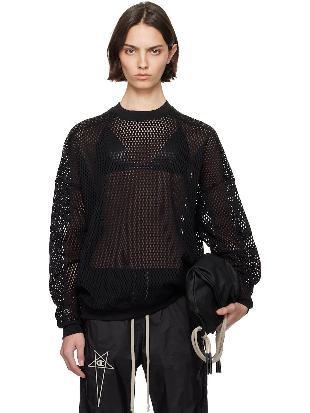 Semi-sheer GOTS-certified organic cotton mesh sweatshirt. · Rib-knit crewneck, hem, and cuffs · Offset shoulder seams · Dropped shoulders · Embroidered logo patch at cuff · Central seam at back Part of the Rick Owens x Champion collaboration. Supplier color: Black 100% cotton. Made in Italy 252232F098003