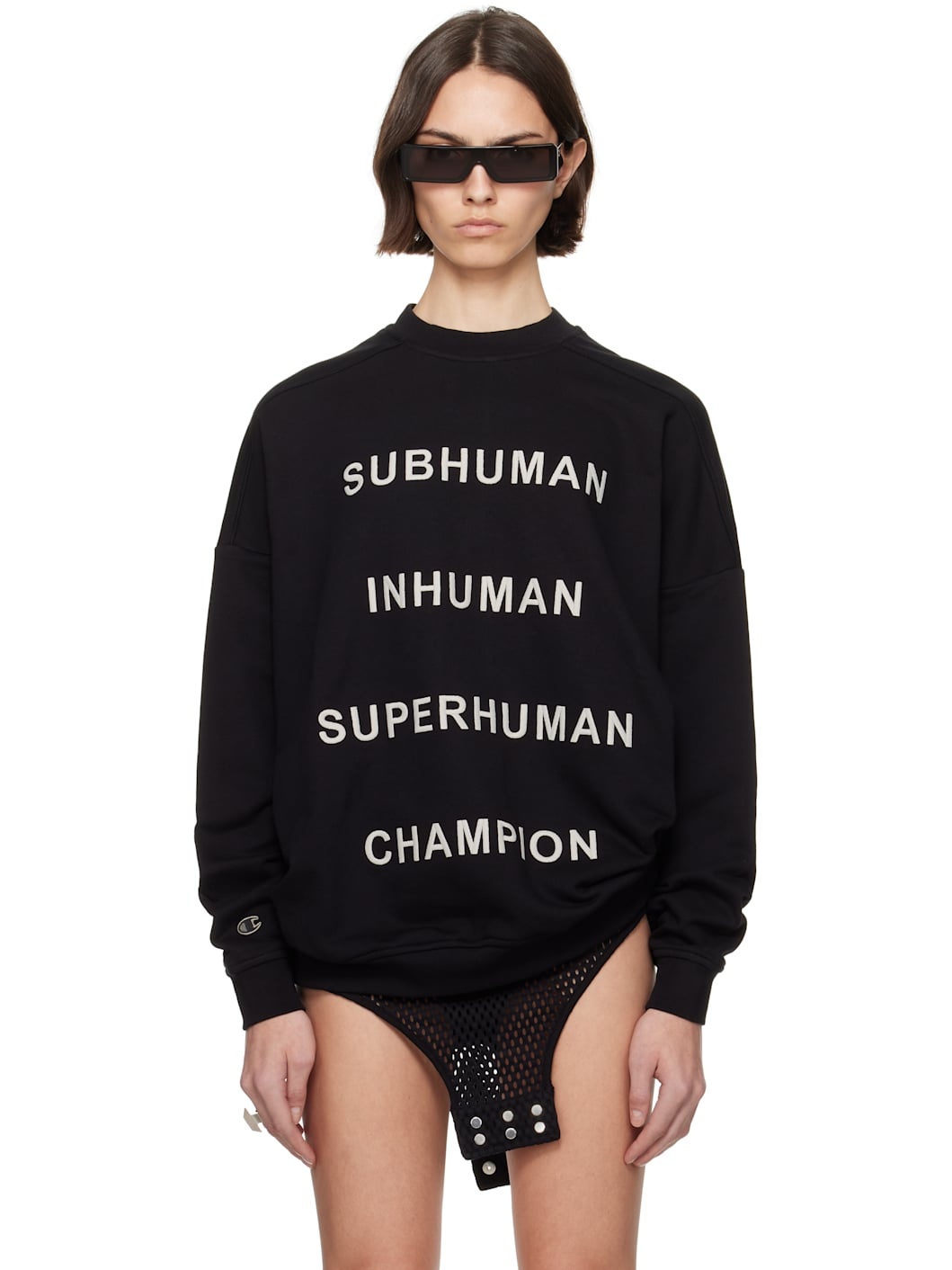 GOTS-certified organic cotton French terry sweatshirt. · Rib-knit crewneck, hem, and cuffs · Text and logo embroidered at front · Offset shoulder seams · Dropped shoulders · Embroidered logo patch at cuff · Central seam at back Part of the Rick Owens x Champion collaboration. Supplier color: Black Body: 100% organic cotton. Trim: 95% cotton, 5% elastane. Made in Italy 252232F098002